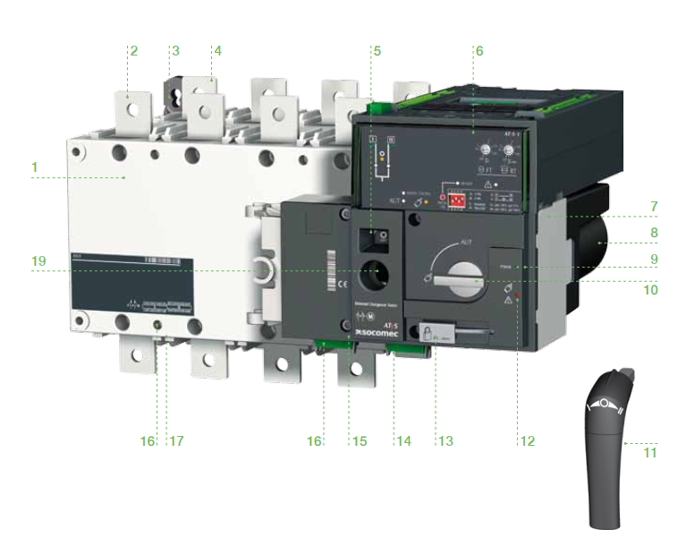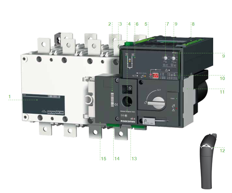| 1. Power Section: Changeover switch assembly with inherent mechanical interlock | 12. Red LED Indication: Product Unavailable / Manual Mode / Fault Condition |