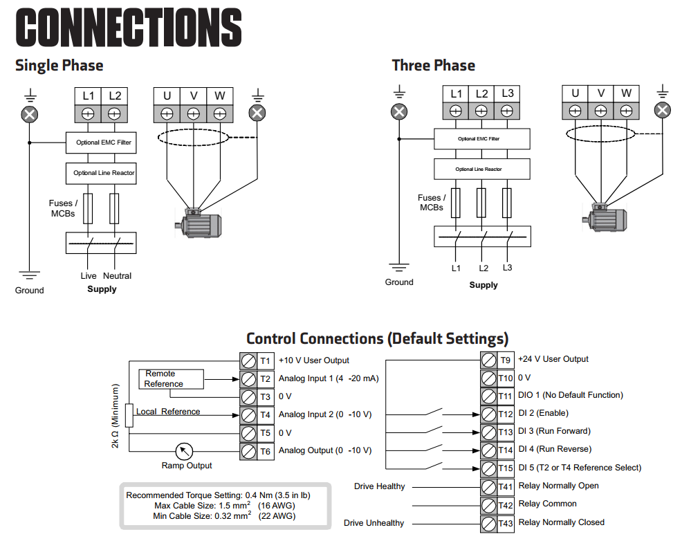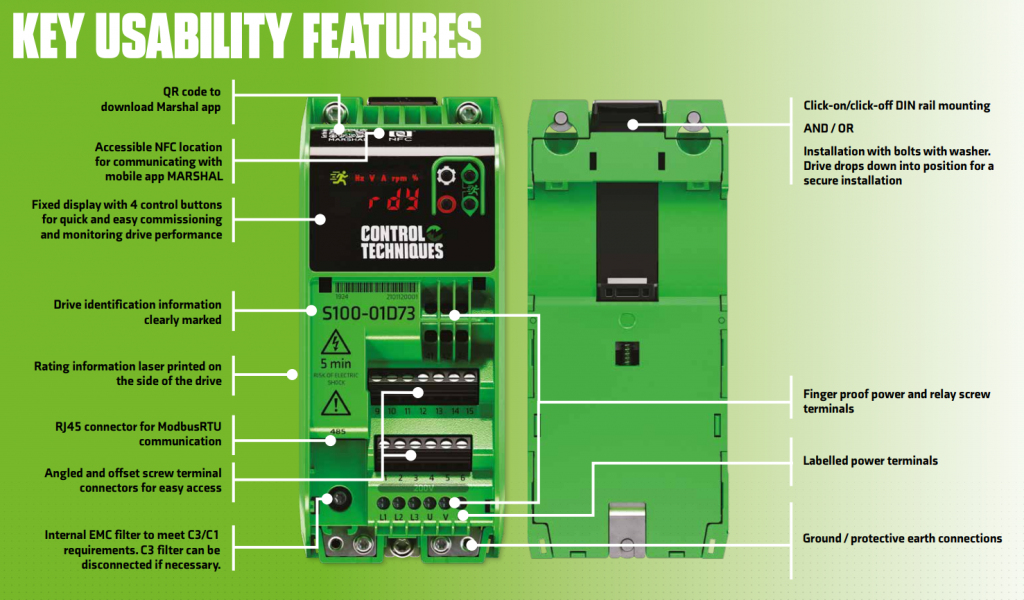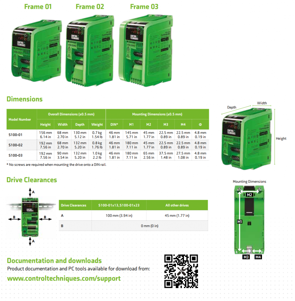 - Dãi công suất: 0.18 kW tới 4 kW (0.25 hp tới 5 hp), điện áp hoạt động gồm 1 pha 100 V và 200 V, 3 pha 200 V và 400 V.