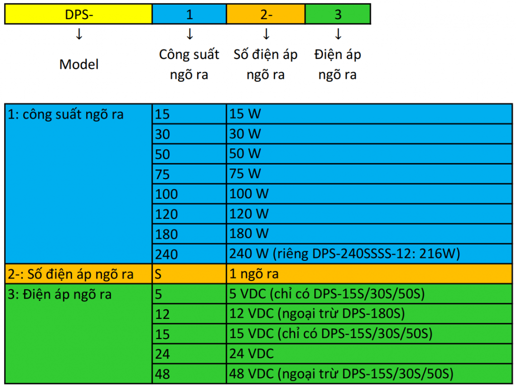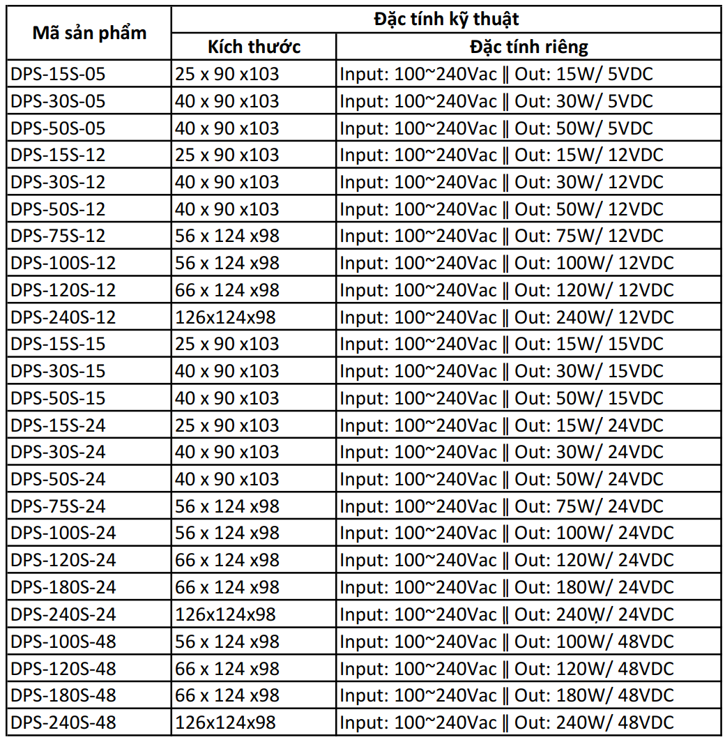 - Điện áp đầu vào từ 100 – 240VAC 50/60Hz (đối với mã sản phẩm 15 đến 100W)