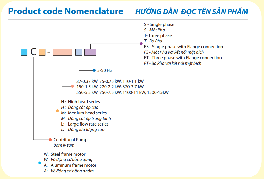B/ Bảng mã sản phẩm – thông số kỹ thuật: