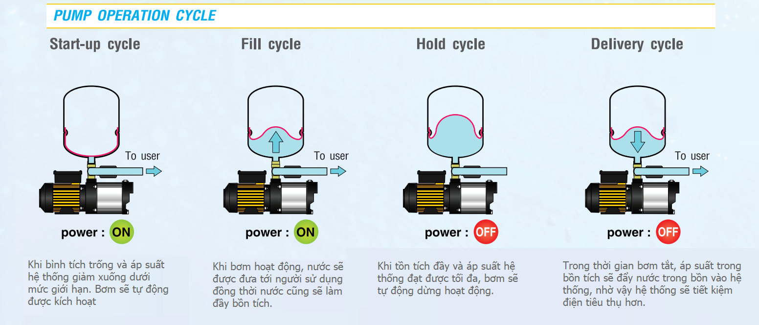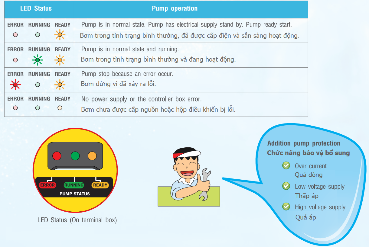 + Ngăn ngừa bơm bị hư hỏng do hoạt động khô cũng như những vấn đề bất thường khác. Bơm cũng tích hợp đèn LED để thông báo tình trạng hoạt động của bơm.