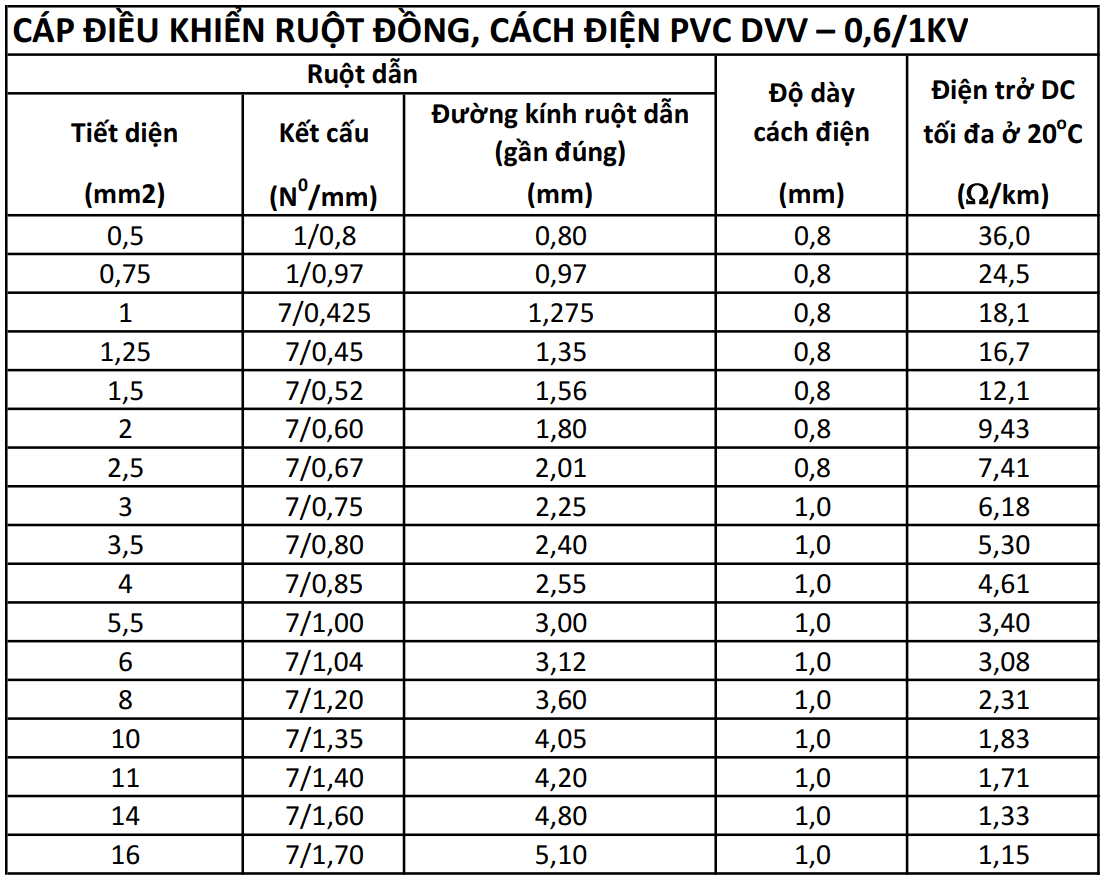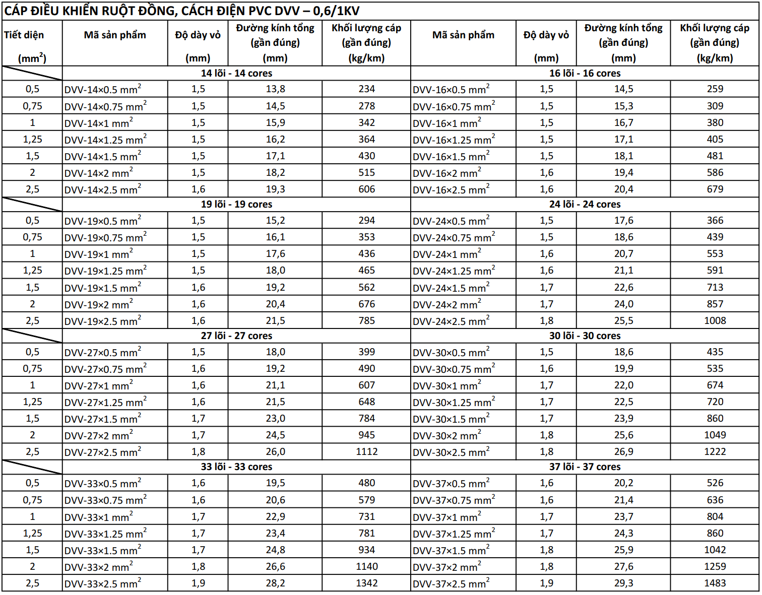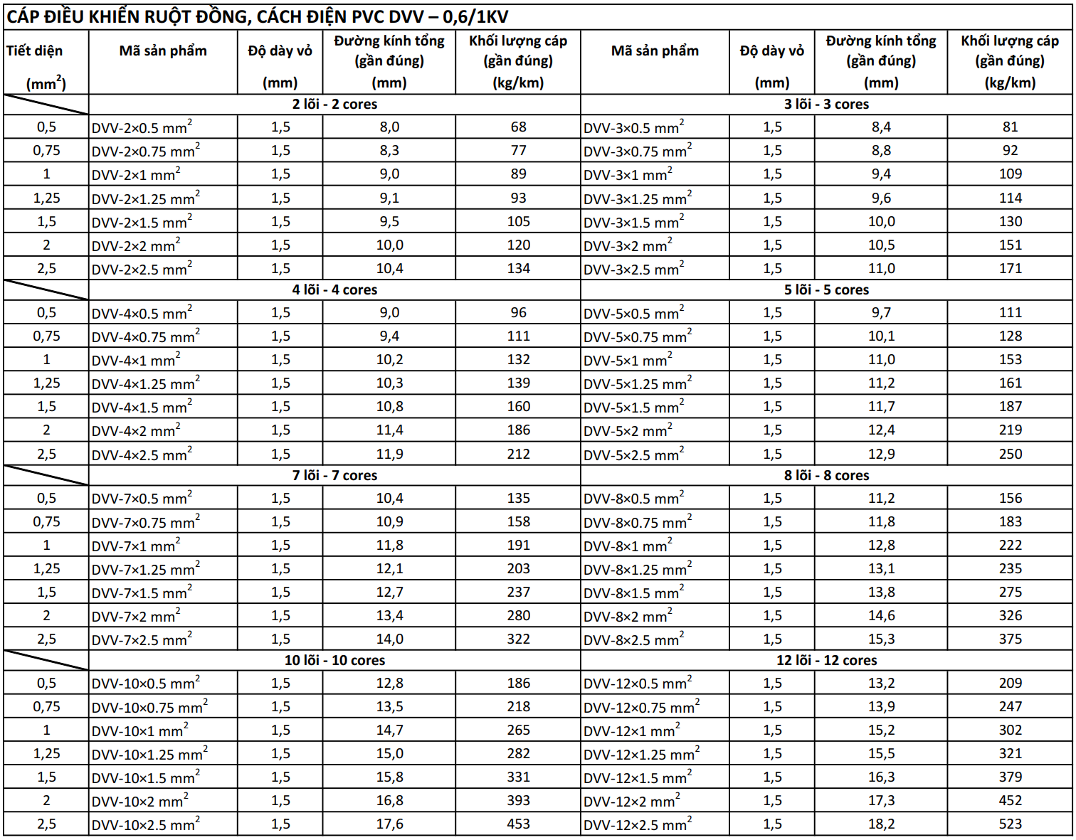 Cáp điều khiển không màn chắn chống nhiễu DVV sử dụng cho mạch điều khiển, cấp điện áp 0,6/1 kV, tần số 50Hz, lắp đặt cố định.