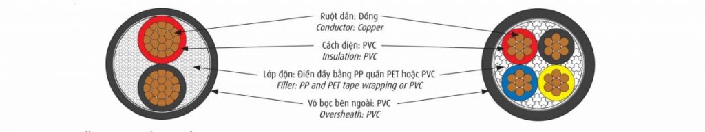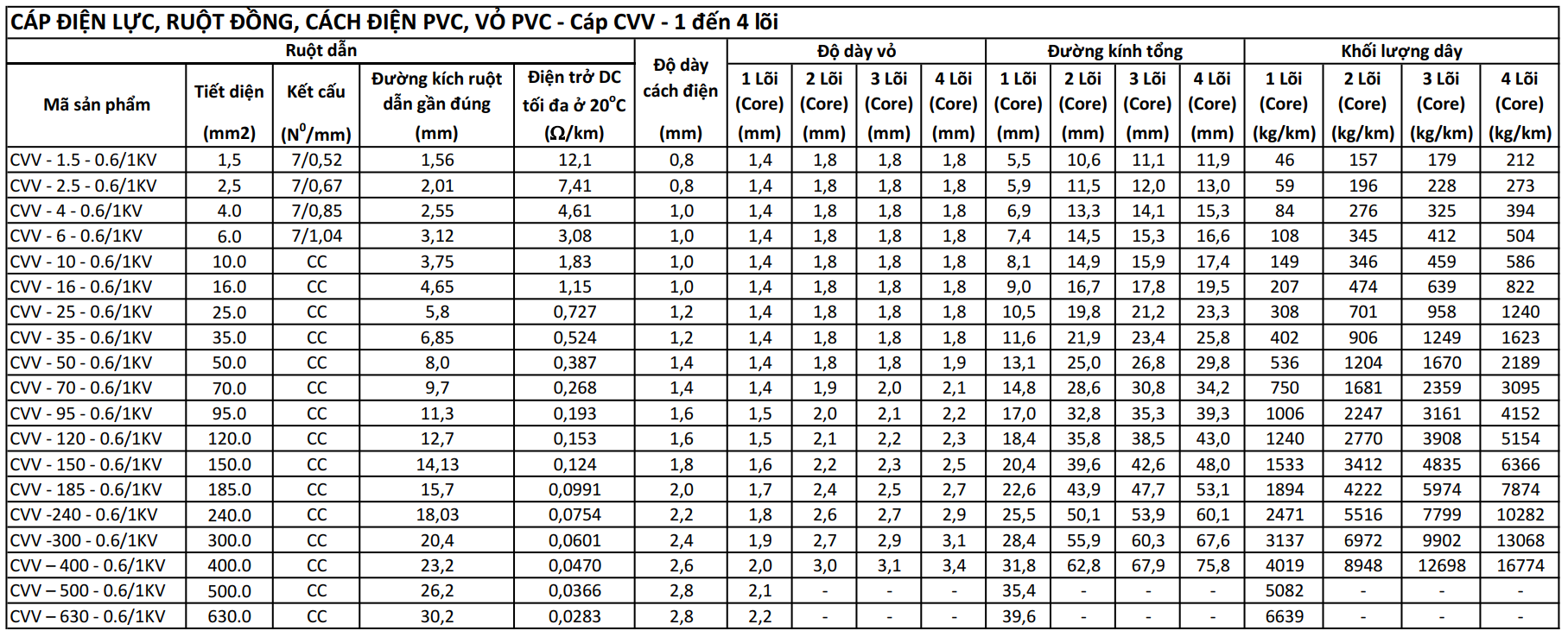Cáp điện hạ thế Cadivi CVV – 0,6/1 KV 1 đến 4 lõi