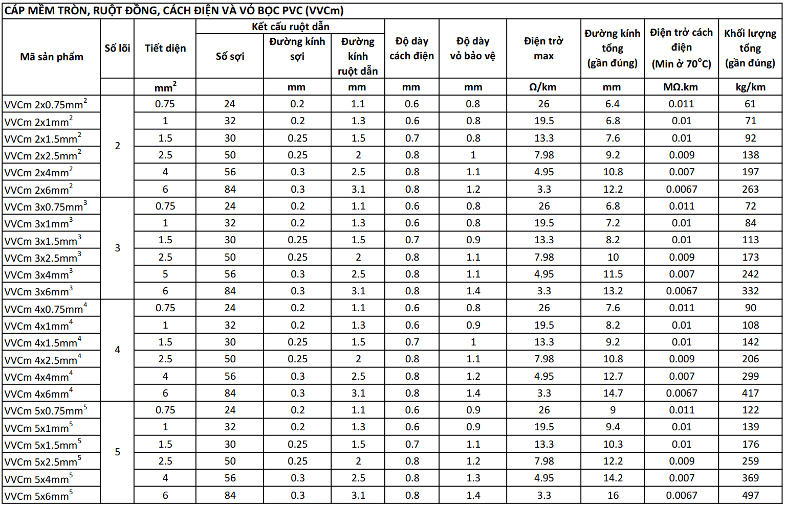 CÁP MỀM TRÒN, RUỘT ĐỒNG, CÁCH ĐIỆN VÀ VỎ BỌC PVC (VVCm)