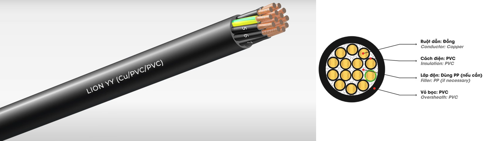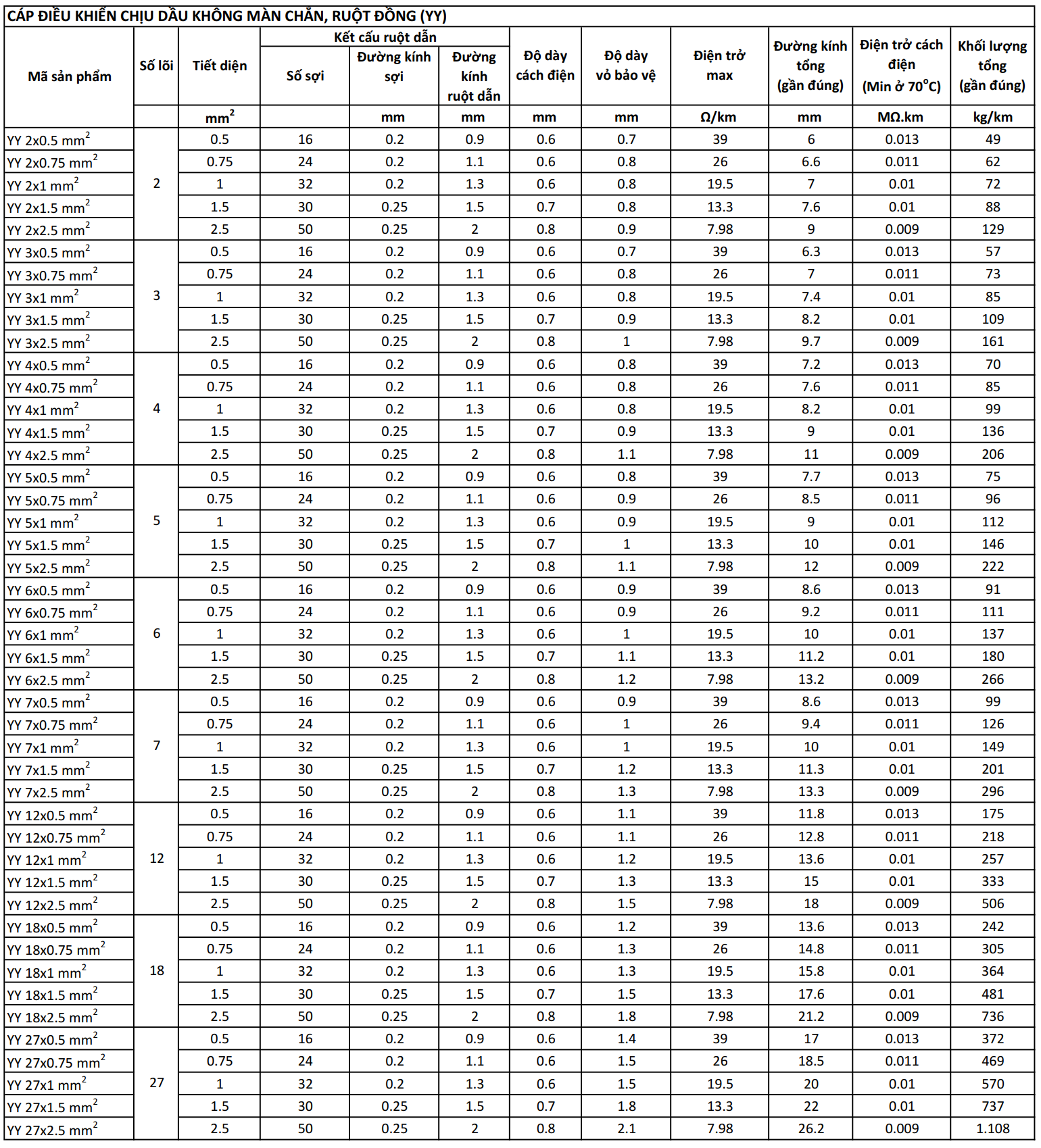 - Cáp điều khiển không màn chắn chống nhiễu YY cách điện PVC, vỏ bảo vệ PVC chịu dầu.