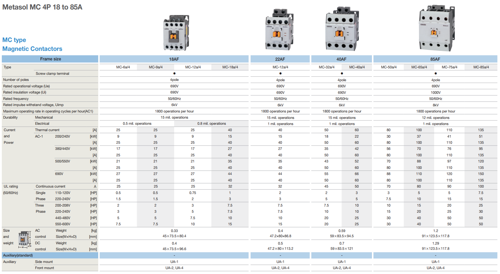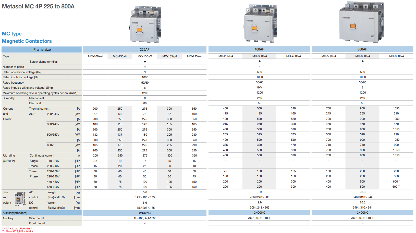 - Contactor 3 Poles: AC Coil 380V, 220V, 110V,… dòng định mức từ 6A đến 800A.