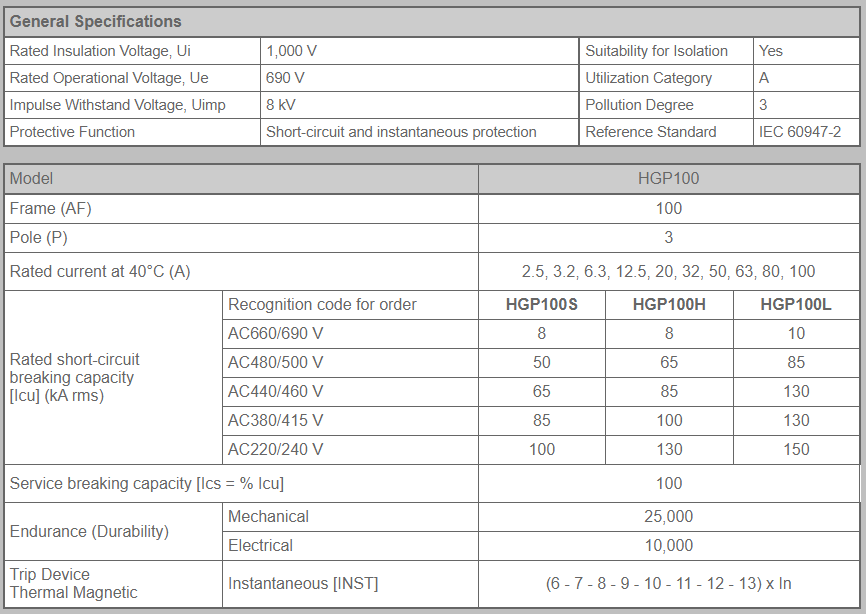 | HGP100S-G3PENS | 40 – 100A | 85kA |