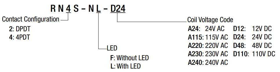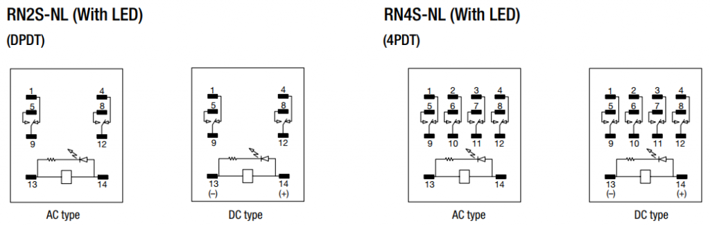| RN2S-NL-D24 | 14 chân dẹp, có đèn | 24VDC | 3A | SN4S-05D |