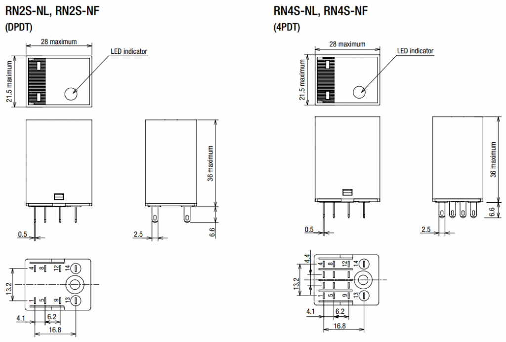 | RN2S-NL-D24 | 8 chân dẹp, có đèn | 24VDC | 5A | SN2S-05D |
